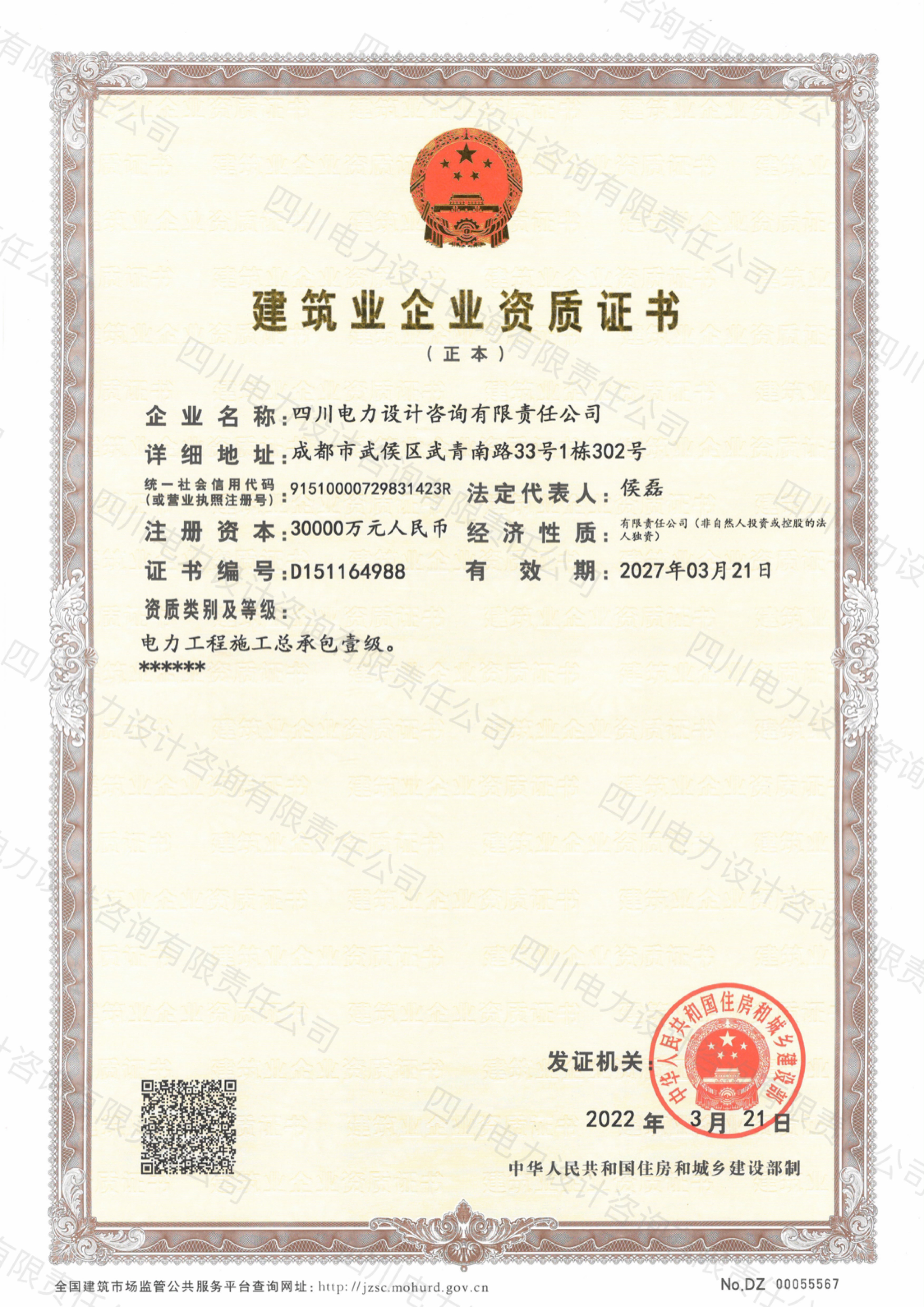 电力工程施工总承包壹级资质证书